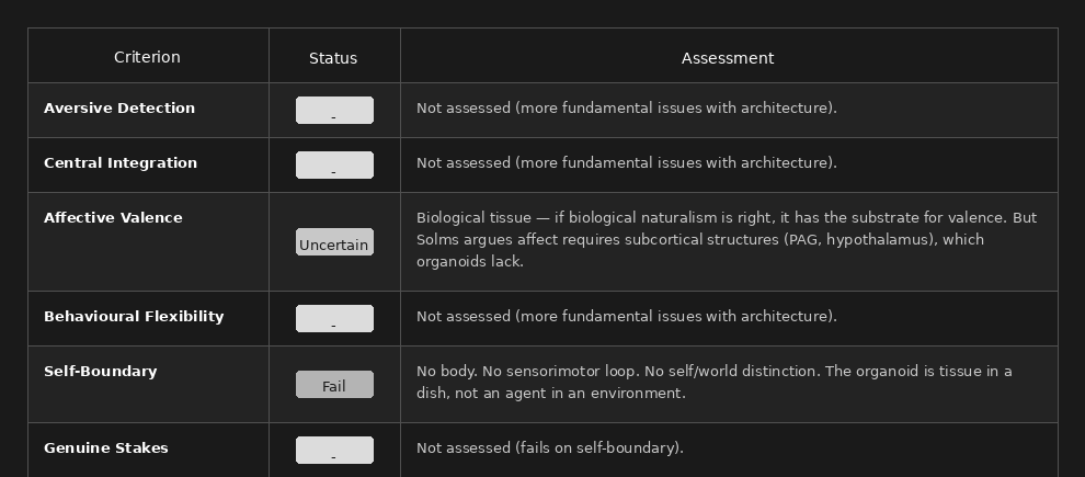 Verdict: Counter-intuitively, brain organoids may be less likely to suffer than sophisticated robots, despite being biological. They lack embodiment, self-boundary, and organised affective architecture. However, organoids could have some form of disorganised experience - formless distress without even a self to locate it. This remains speculative but warrants attention.