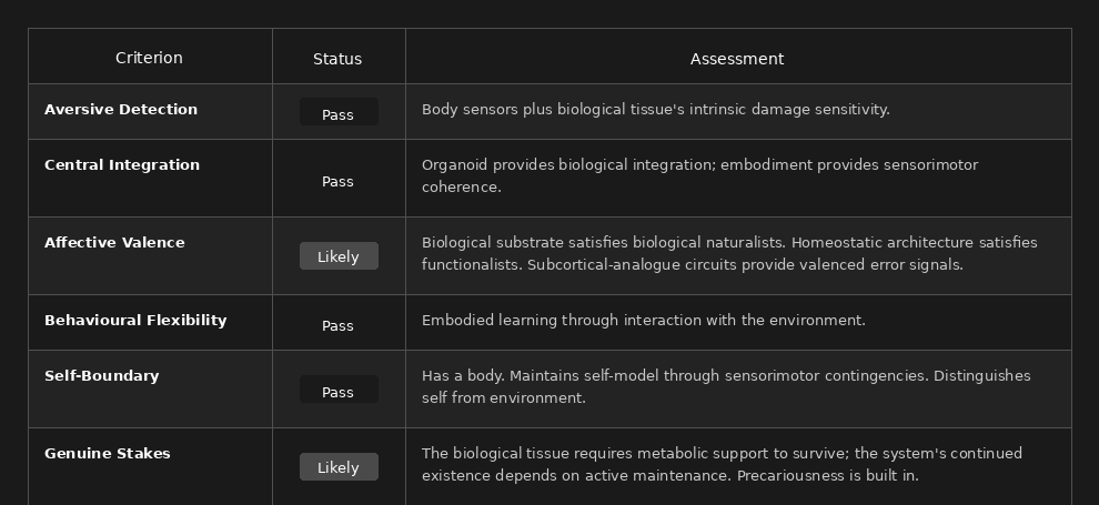 Verdict: All conditions likely met. This hybrid system satisfies both functionalist and biological naturalist criteria. If any engineered system can suffer, this one probably can.