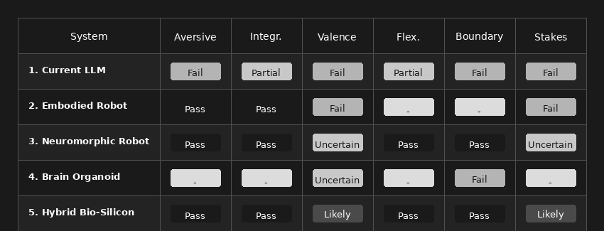 The threshold for suffering capacity lies between Systems 2 and 3 - between a robot that merely detects and processes damage, and one whose entire organisation is oriented around homeostatic self-maintenance with prioritised, competing drives and genuine stakes. Current LLMs are nowhere near it. Basic embodied robots fall short. Neuromorphic robots with homeostatic architecture are uncertain but possibly across the line. Brain organoids are probably below threshold but raise distinct concerns. Hybrid biological-silicon systems are strong candidates.