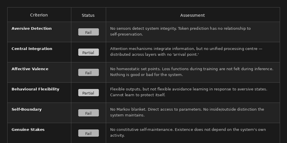 Verdict: Current LLMs fail on the most fundamental conditions. They have no integrity to threaten, no stakes, no self-boundary. Zero suffering capacity. As Anil Seth puts it, they are “statistical transformers, continuously dependent on previously trained data and external prompting” - not autonomous individuals.